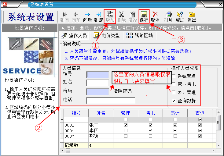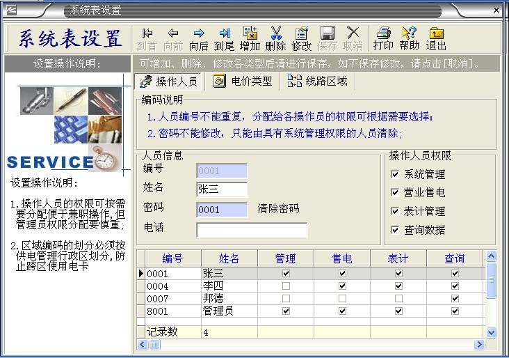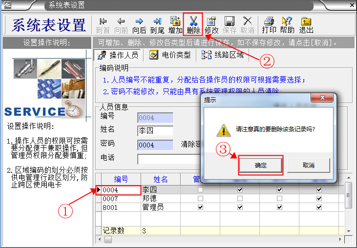 系統默認的管理人員有“張三、李四、德邦、管理員”。 其中“管理員”是最高權限擁有者,不能刪除。其它人員能夠隨意刪除增加。